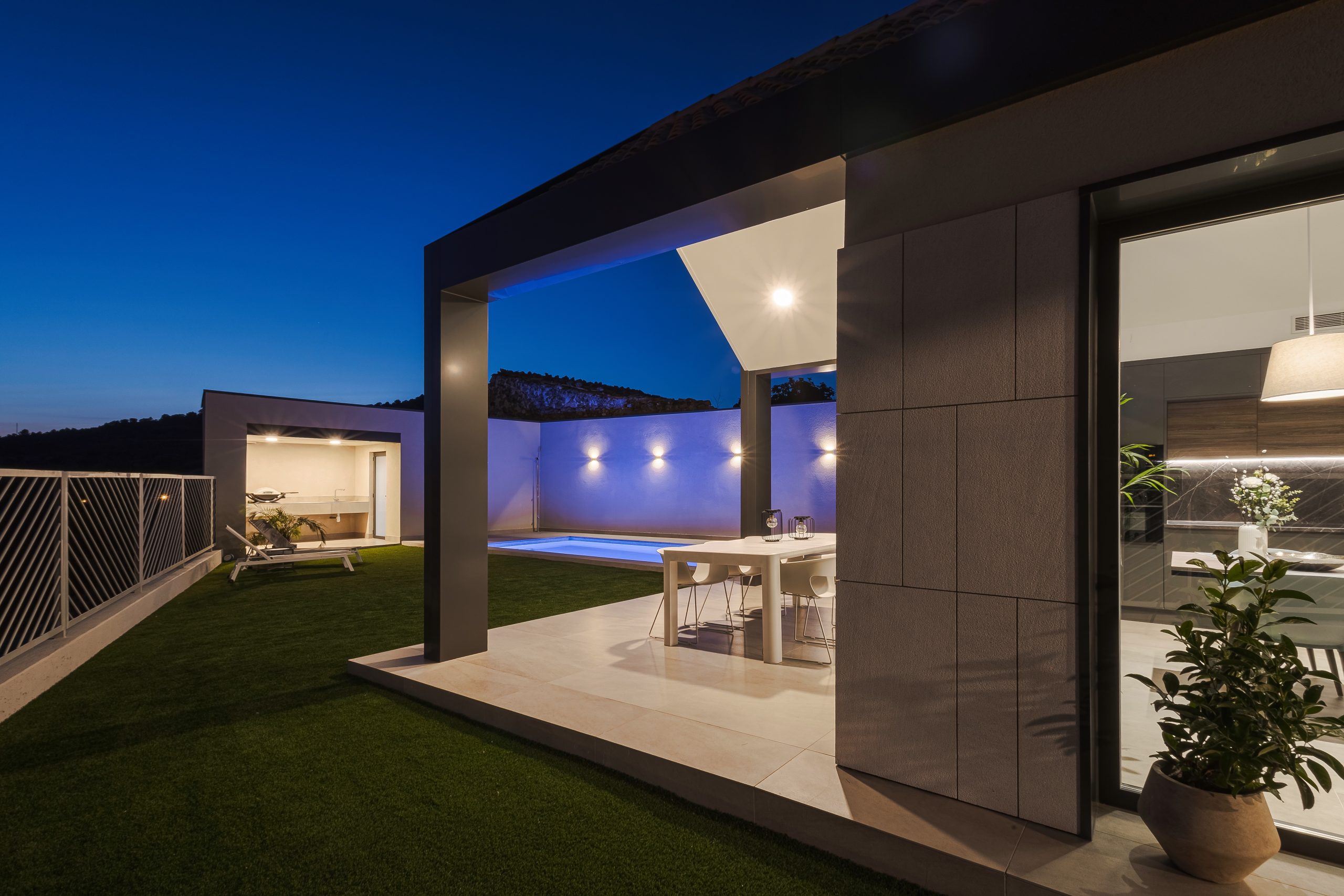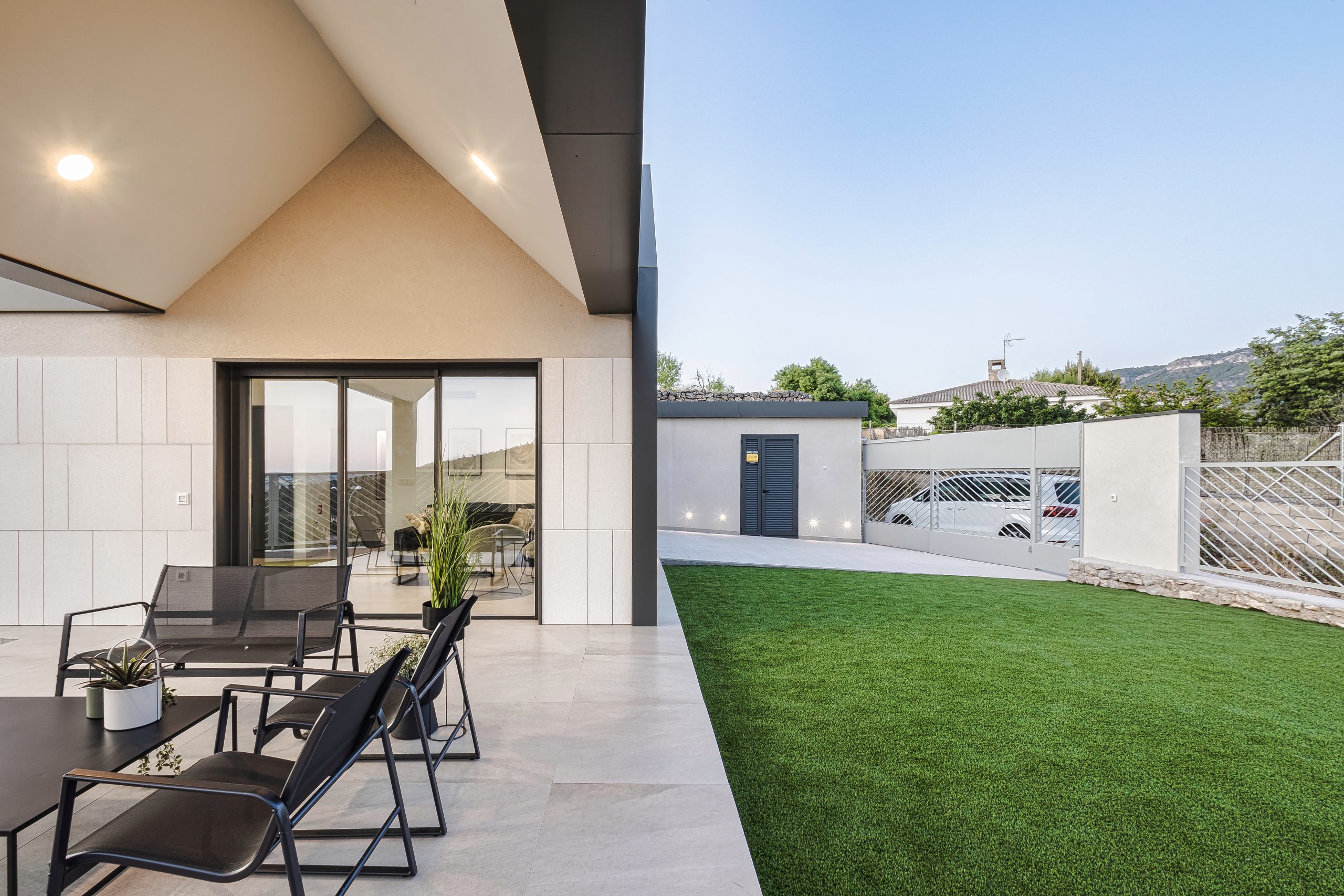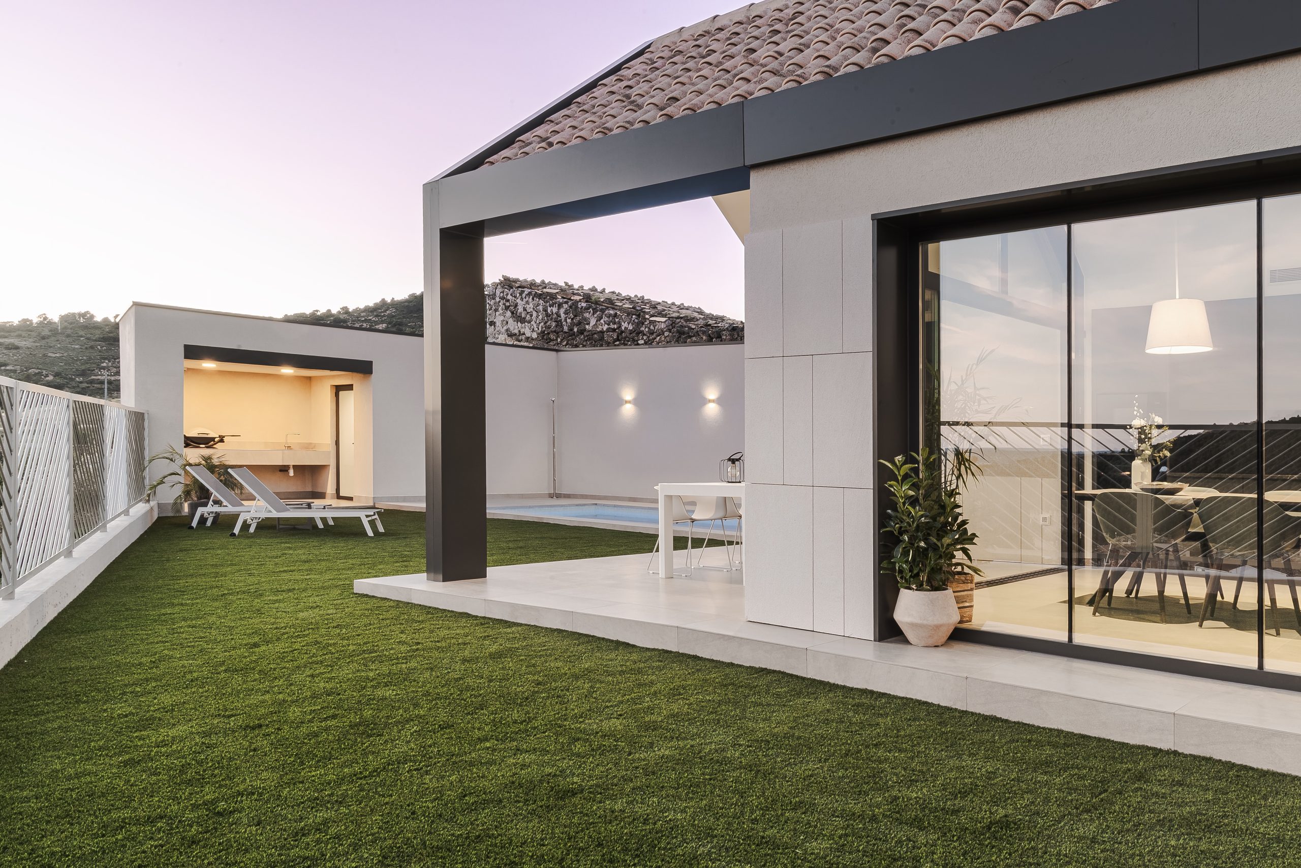 Zonas verdes cuidadosamente diseñadas rodean la villa, con espacios pensados para distintos momentos del día. Destaca una zona de barbacoa con aseo exterior y un jardín orientado hacia las vistas panorámicas.