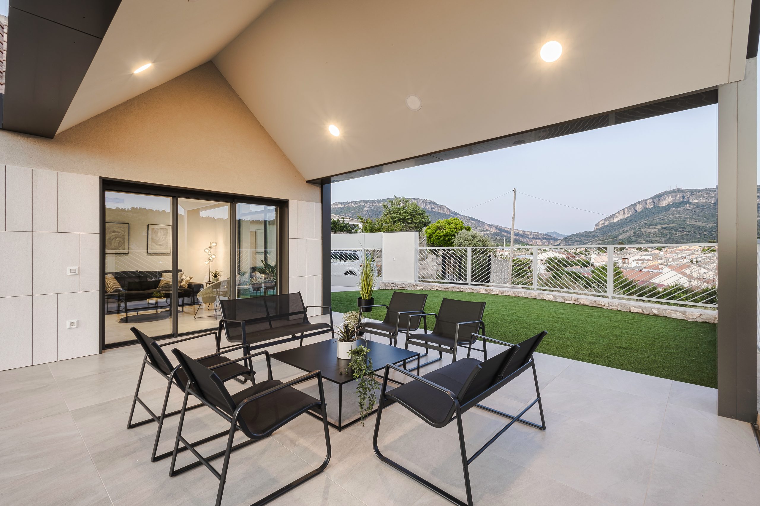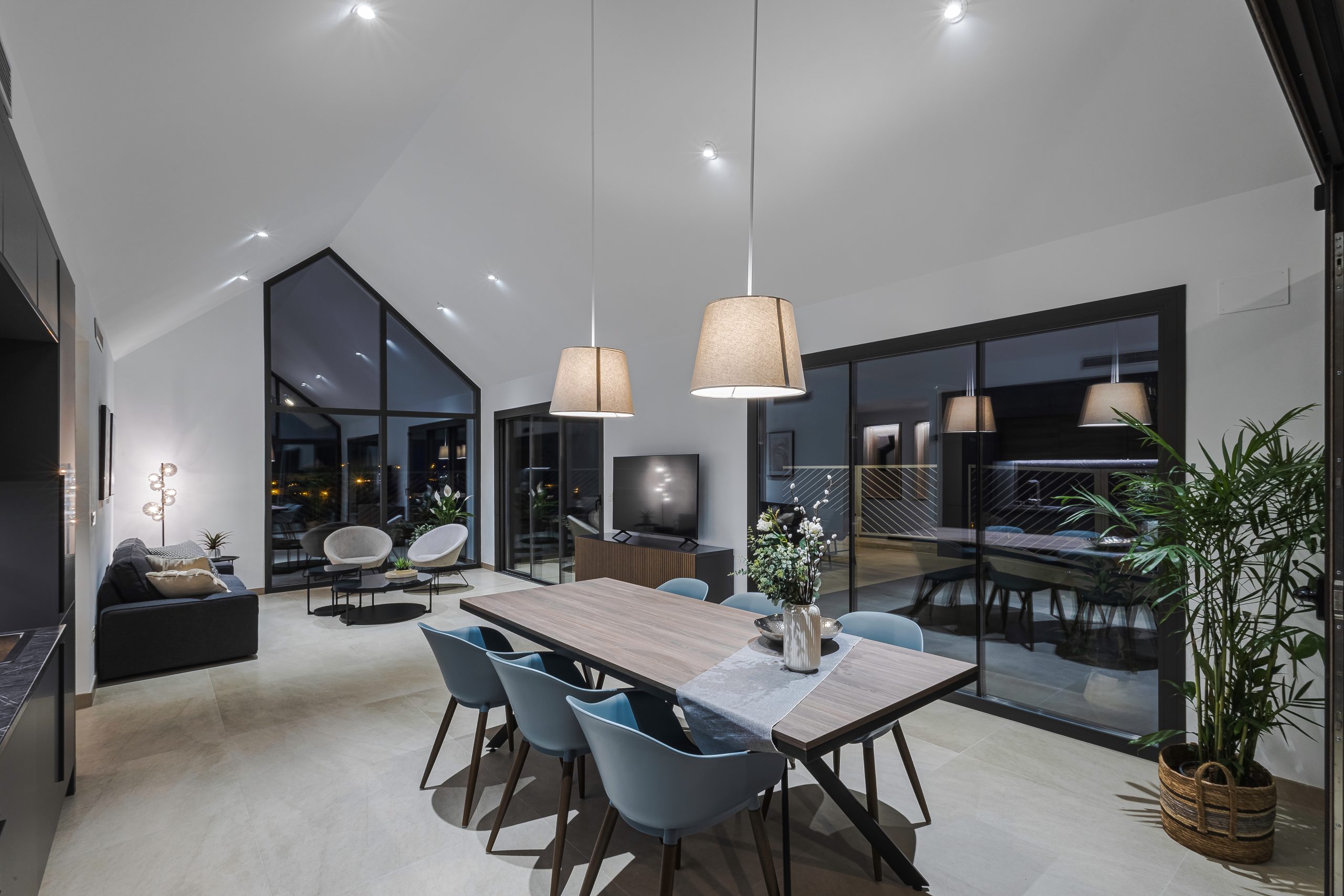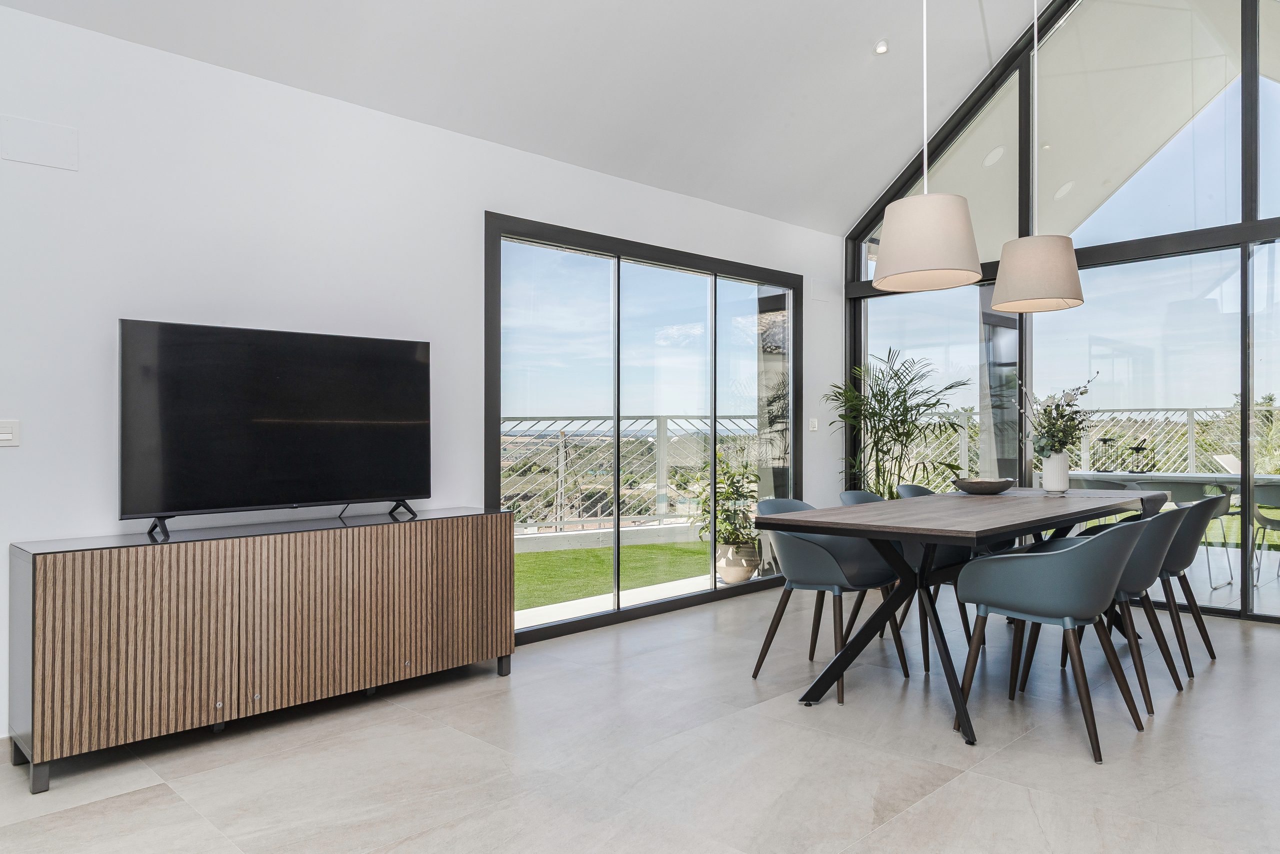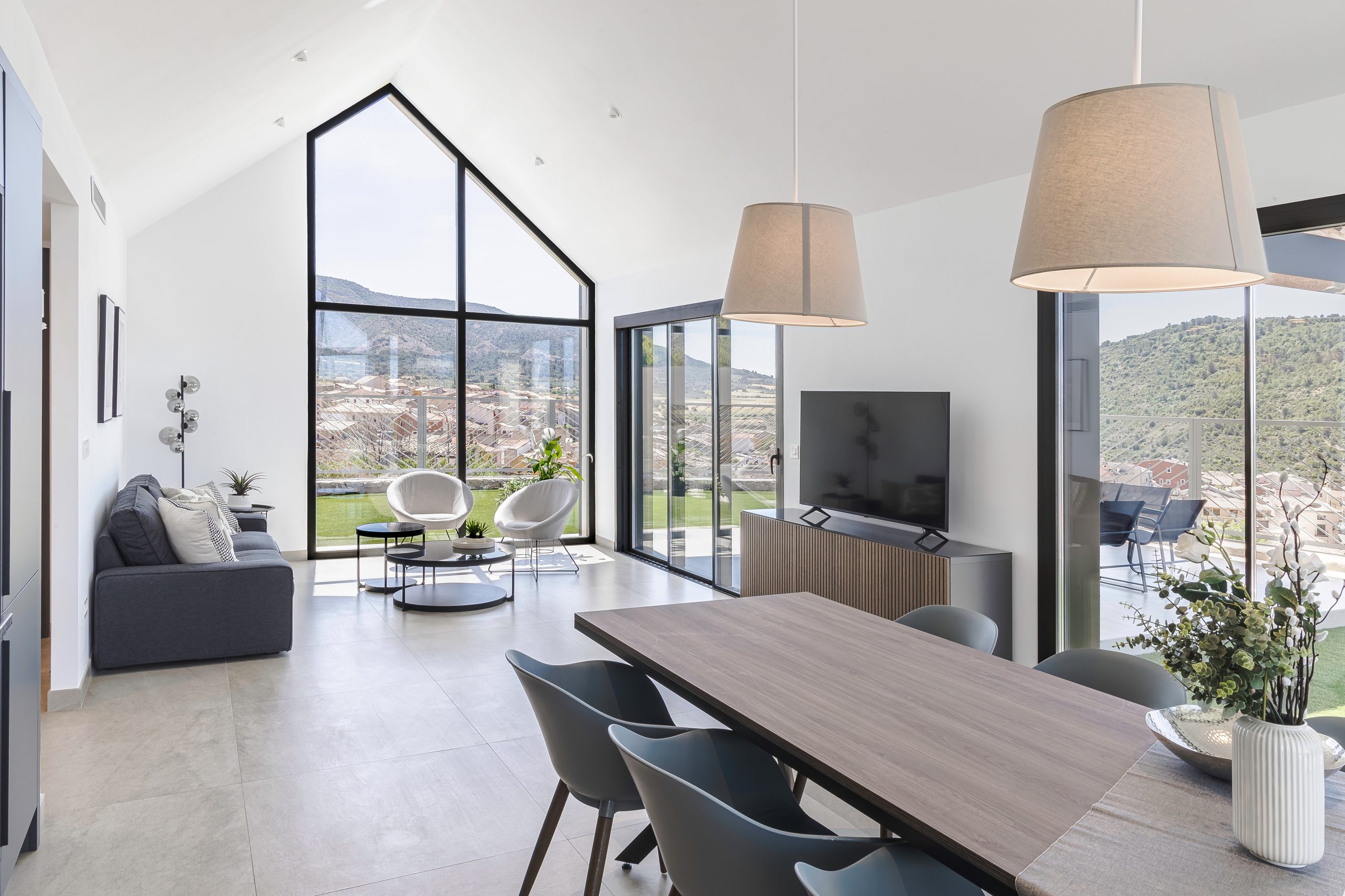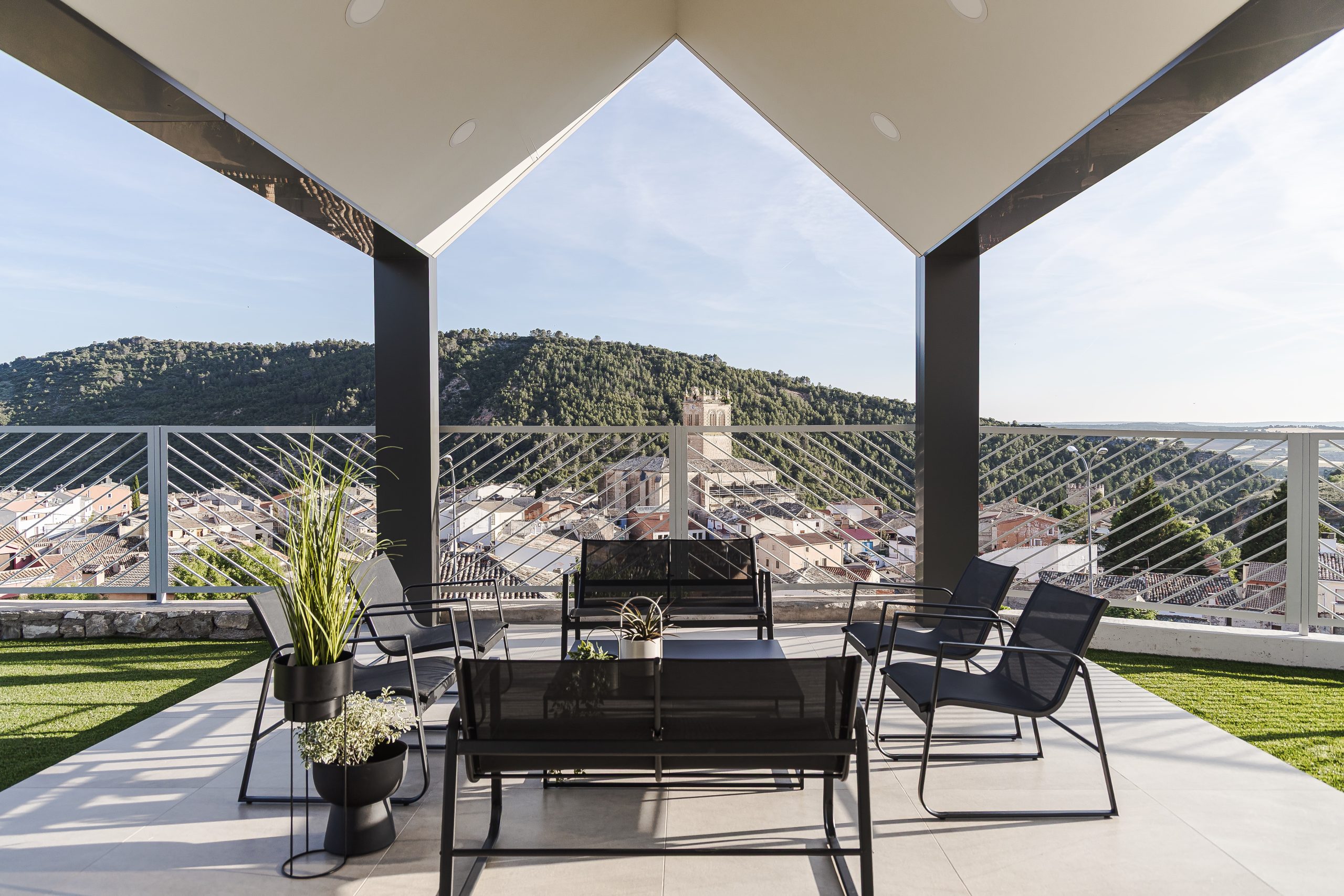 Cuenta con grandes ventanales correderos que conectan con el porche principal, y la zona de sofás de exterior. Desde allí podréis disfrutar de las impresionantes vistas panorámicas del entorno de Priego.
