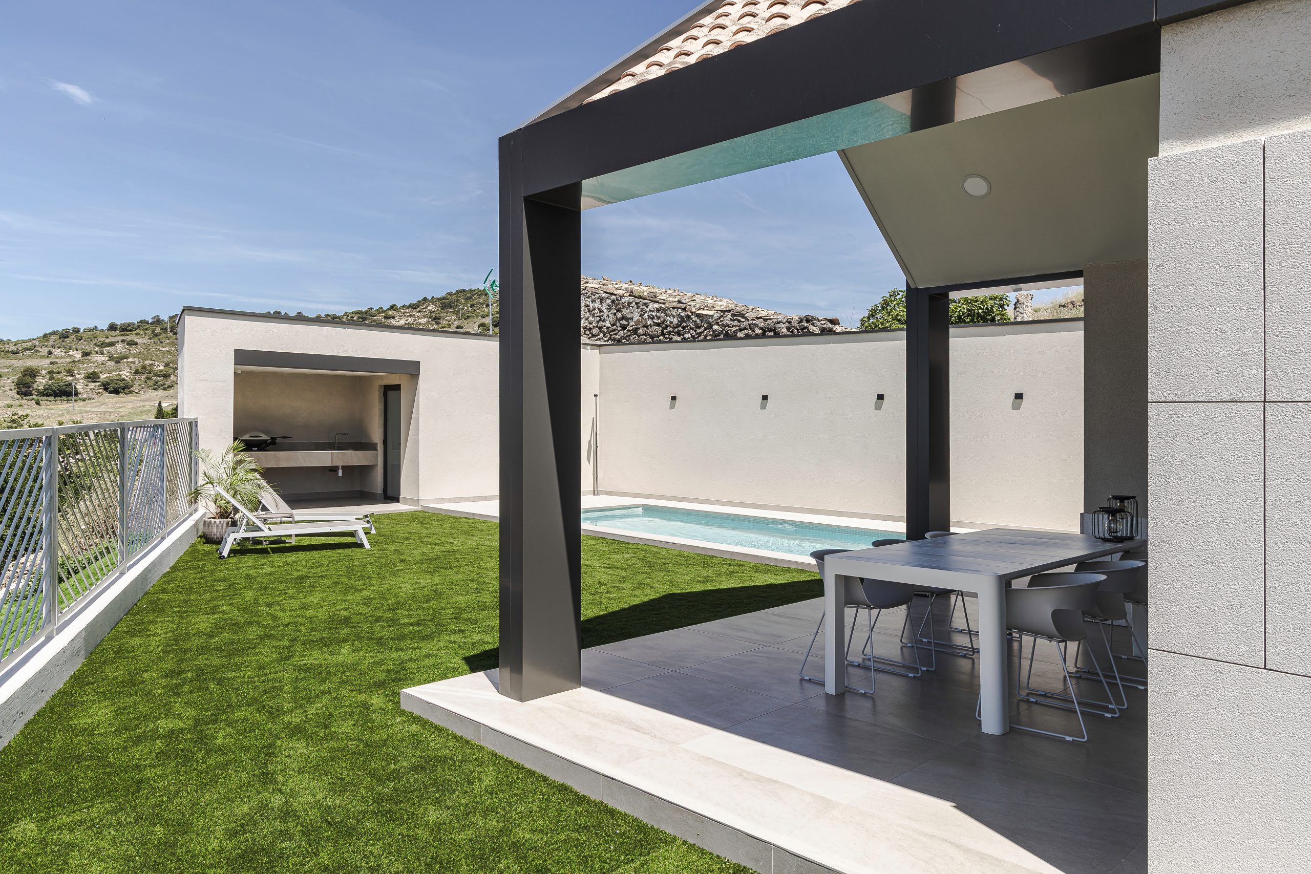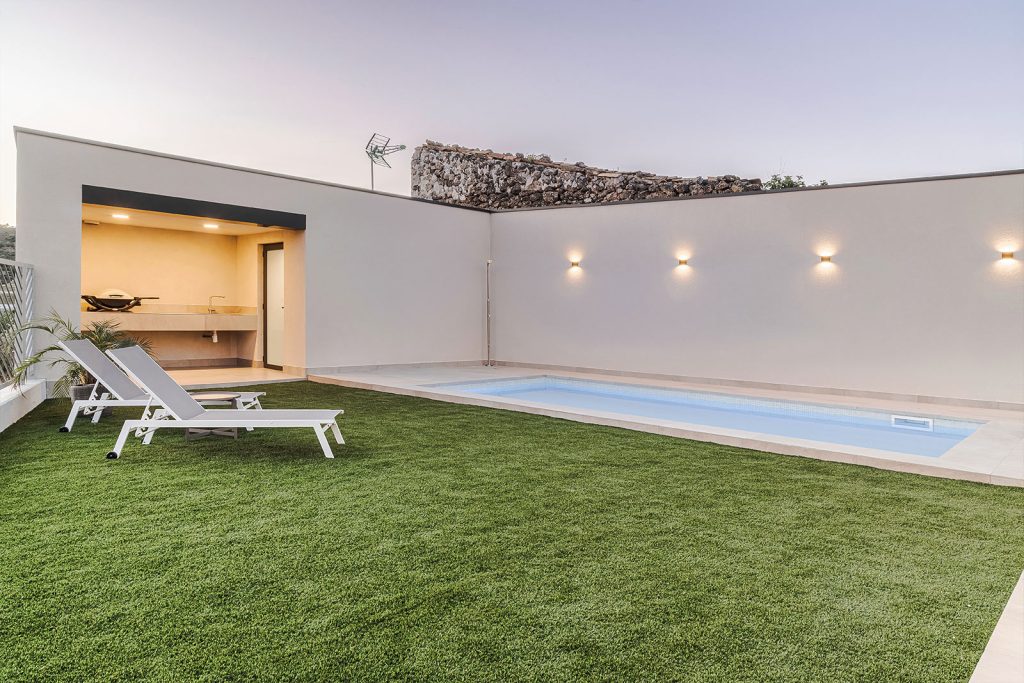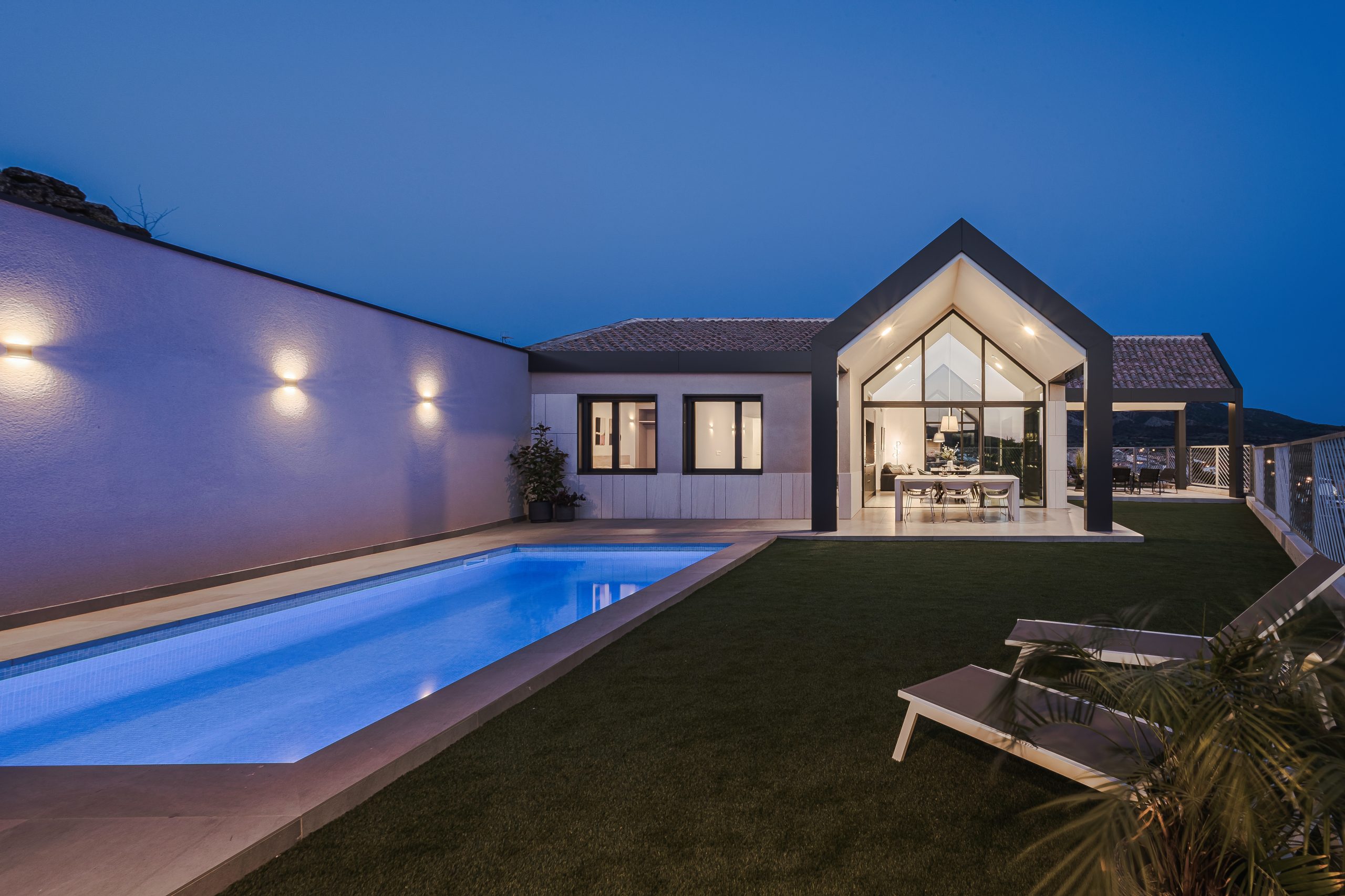 La zona exterior de Villa Atalaya es un auténtico refugio para el disfrute. La piscina privada, rodeada de césped y con vistas abiertas e impresionantes, invita a refrescarse, relajarse y disfrutar del sol.
