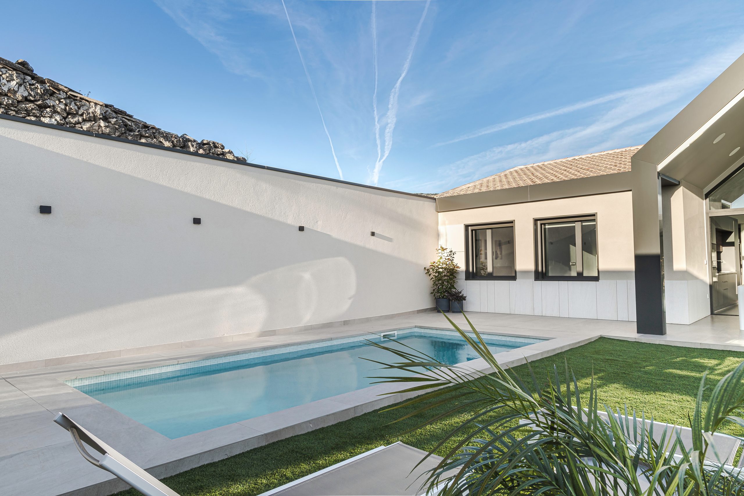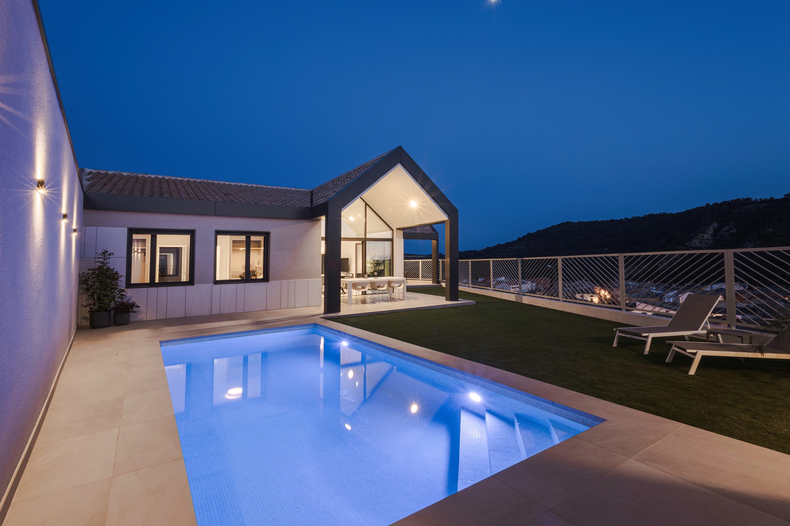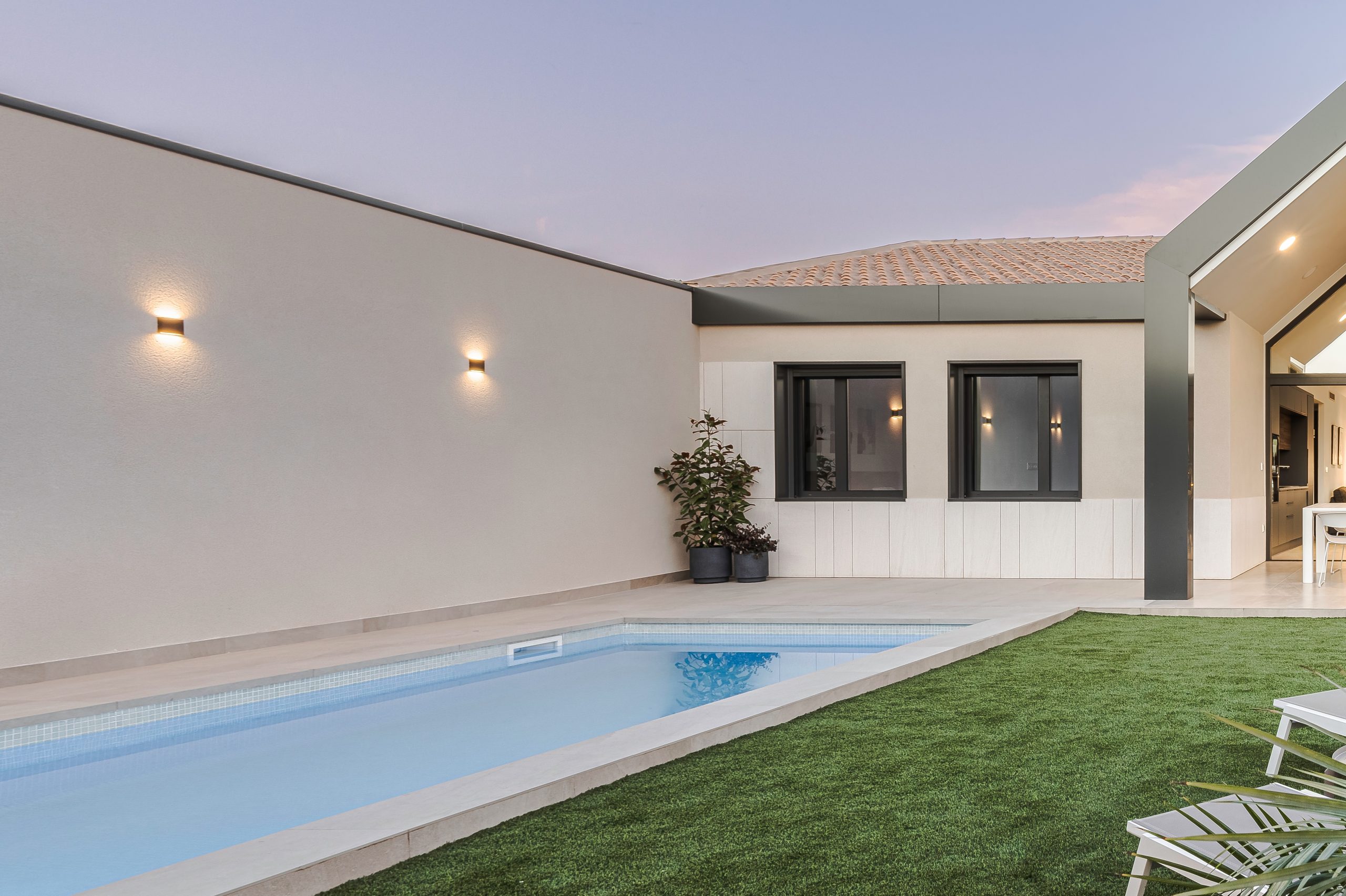 La zona exterior de Villa Atalaya es un auténtico refugio para el disfrute. La piscina privada, rodeada de césped y con vistas abiertas e impresionantes, invita a refrescarse, relajarse y disfrutar del sol.