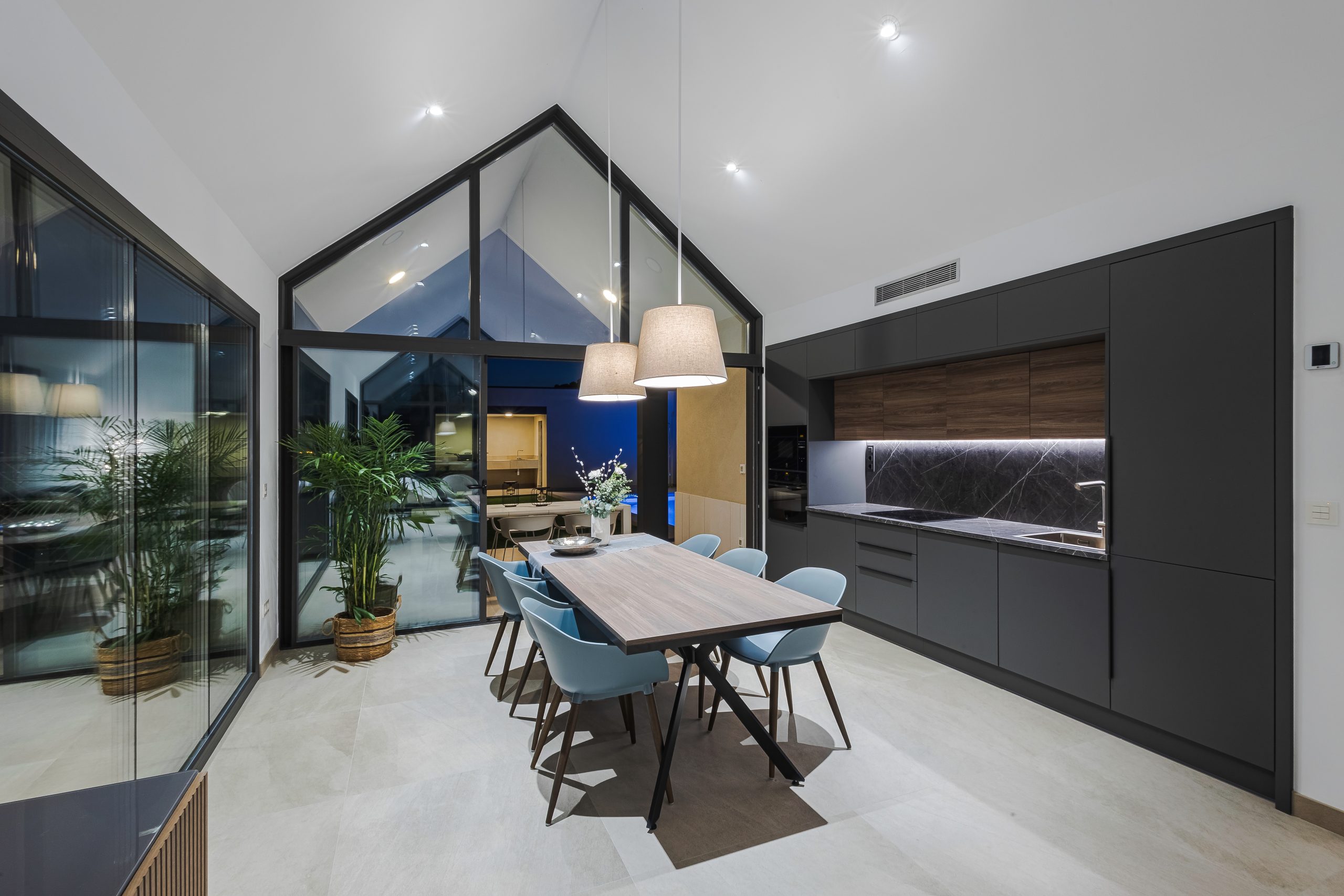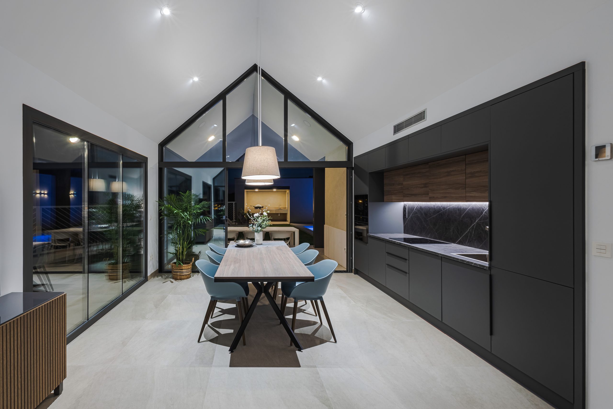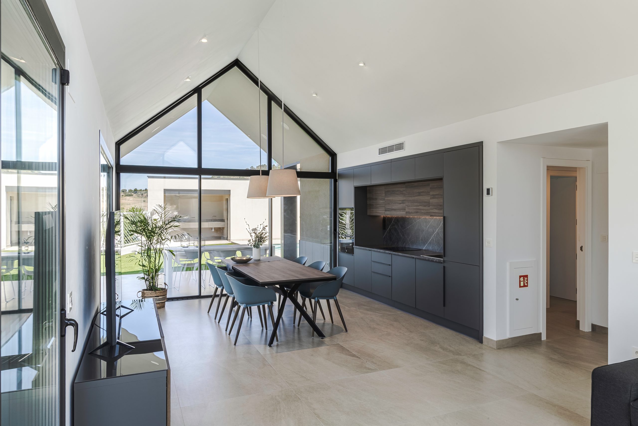 La cocina, completamente equipada, se integra con el comedor creando un espacio abierto y versátil. Con conexión directa al porche que se abre a la piscina, es el espacio perfecto para desayunos y comidas al aire libre, rodeados de calma y naturaleza.