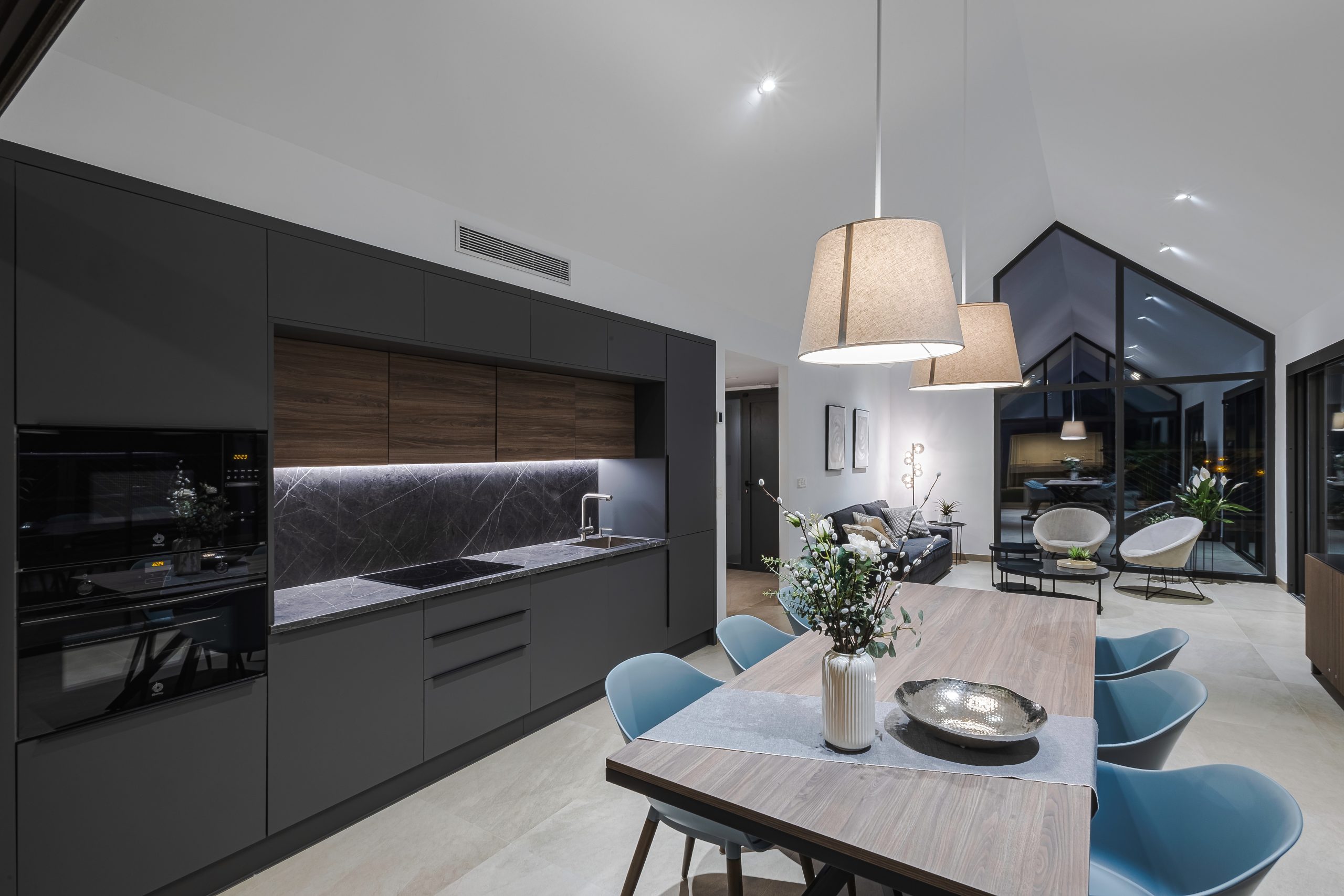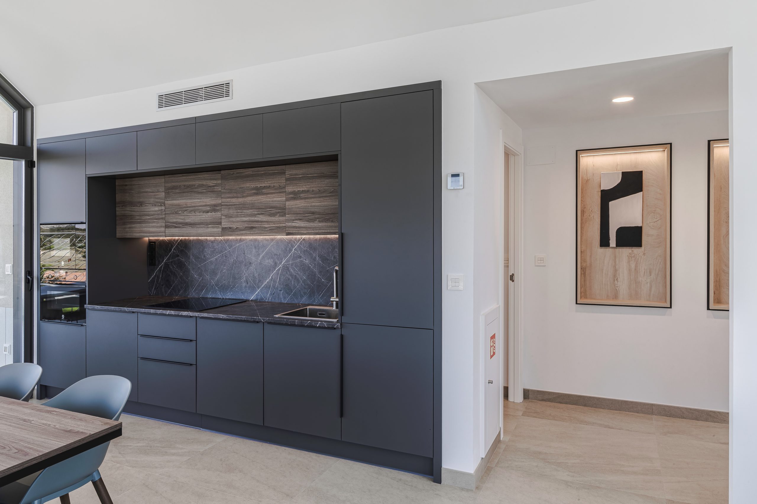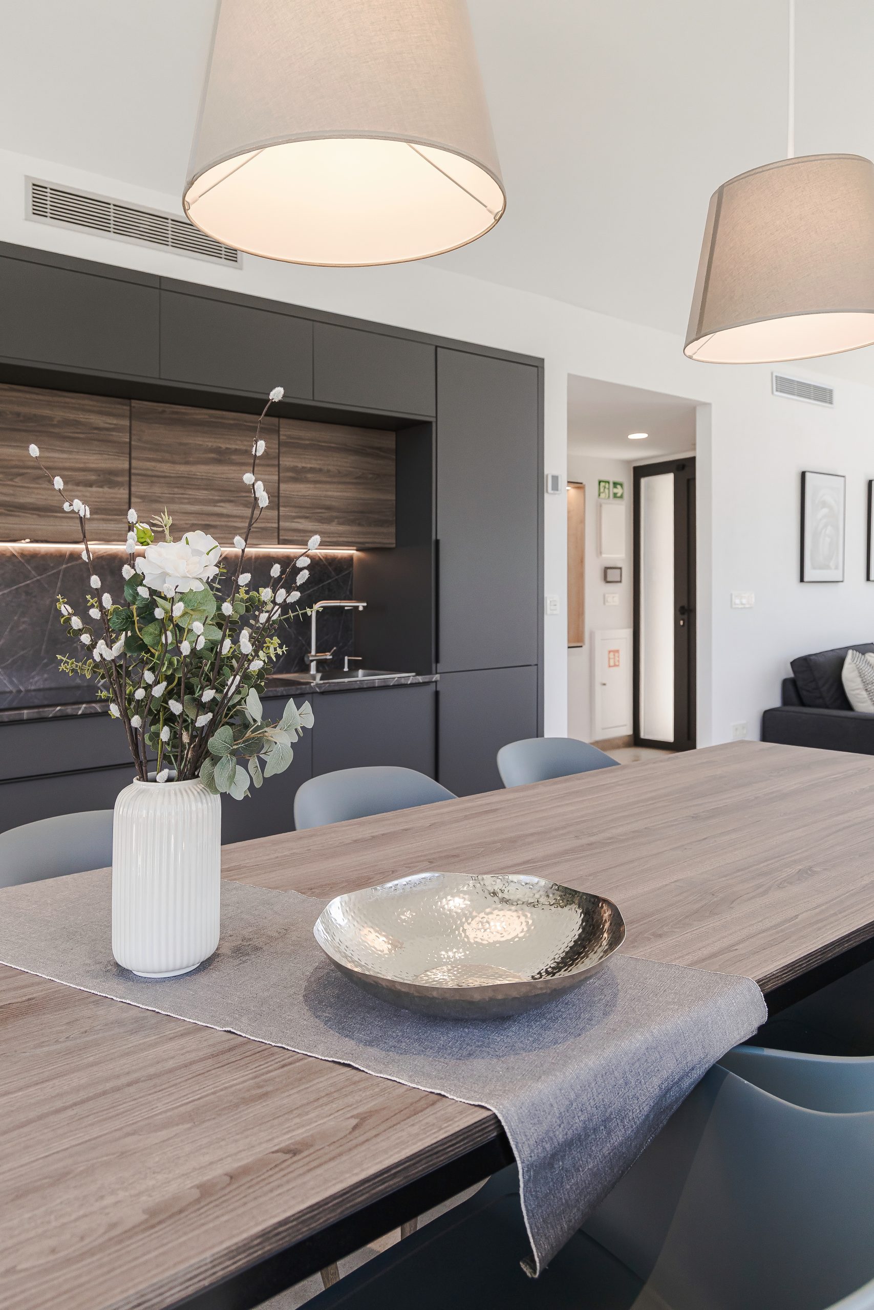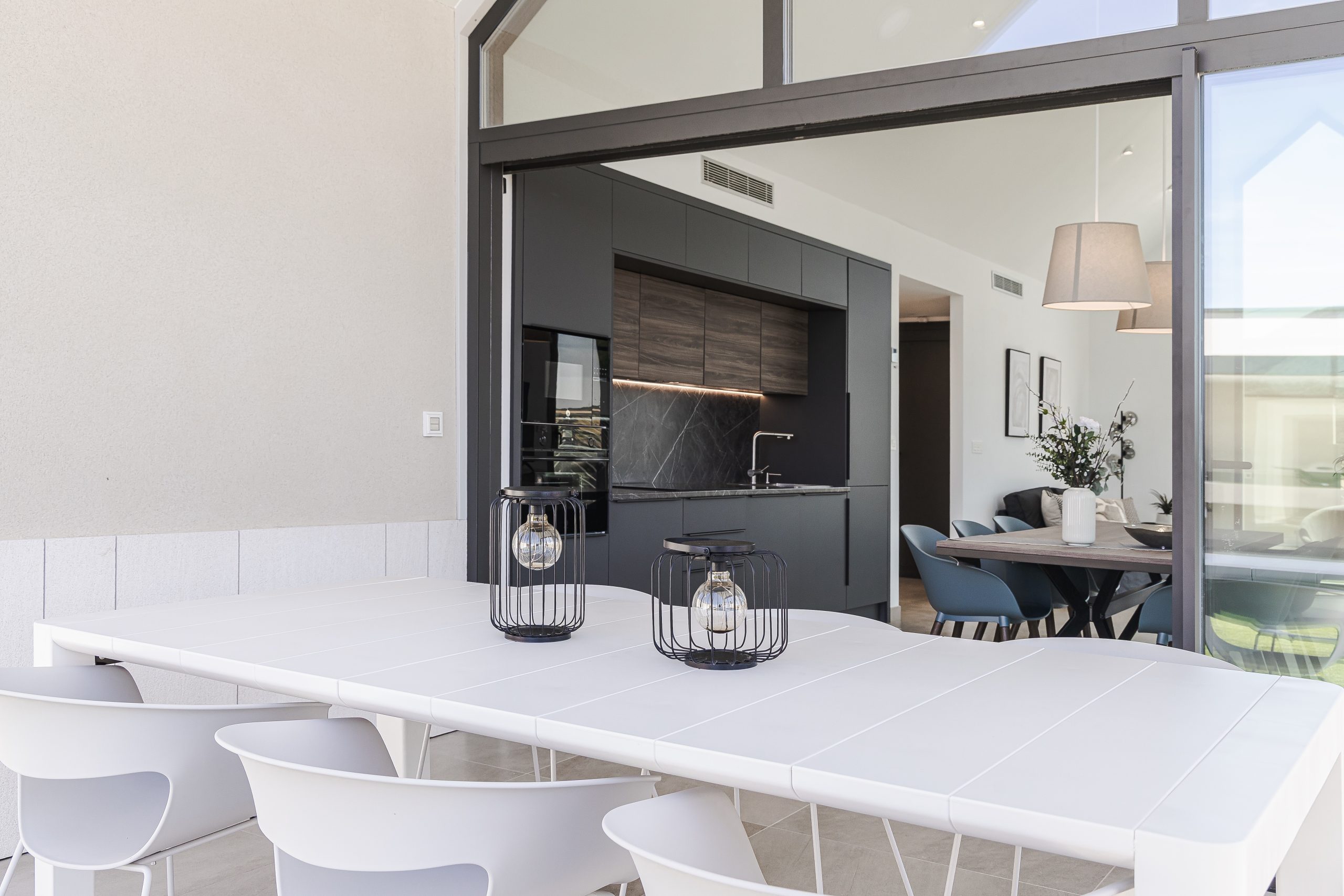 La cocina, completamente equipada, se integra con el comedor creando un espacio abierto y versátil. Con conexión directa al porche que se abre a la piscina, es el espacio perfecto para desayunos y comidas al aire libre, rodeados de calma y naturaleza.