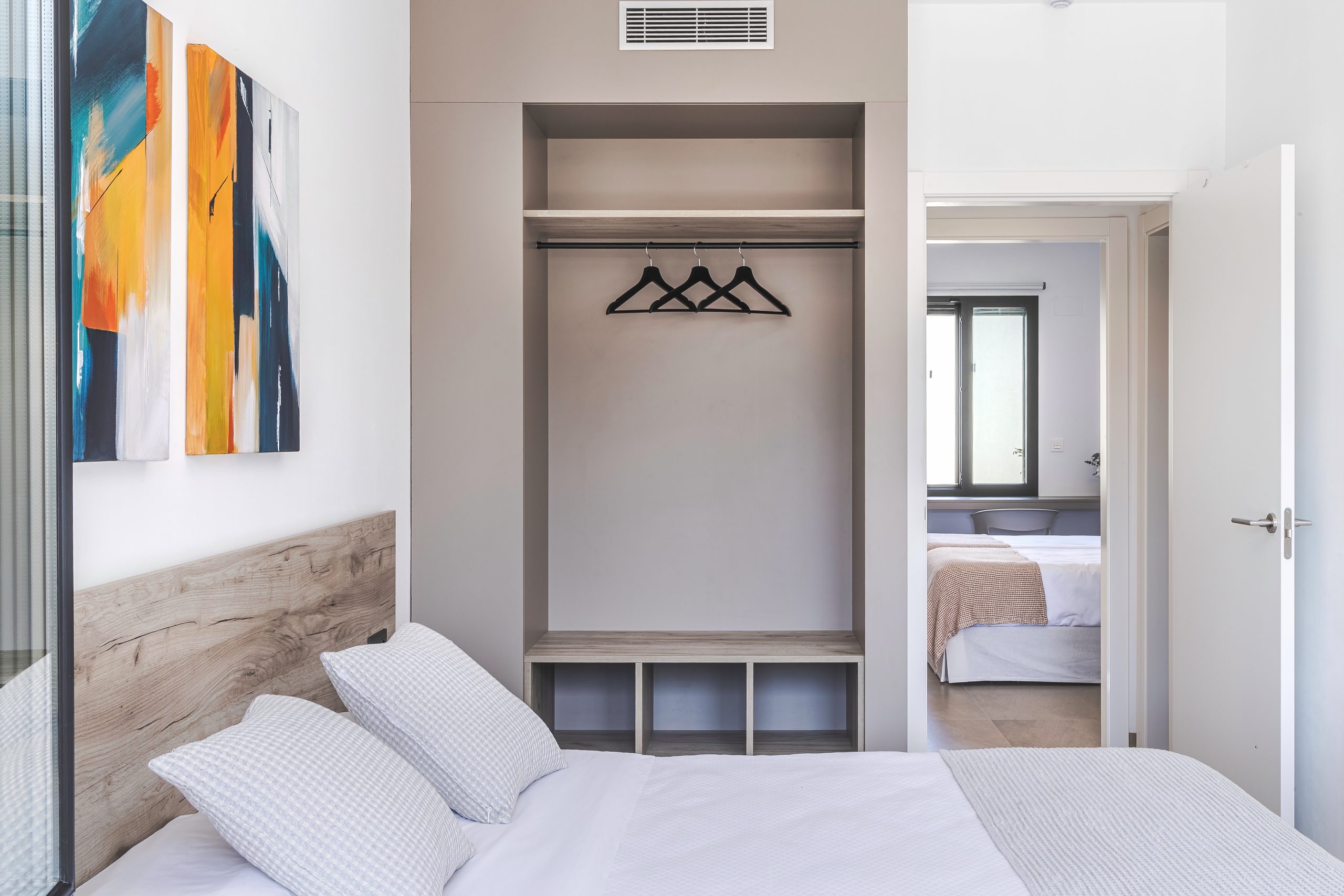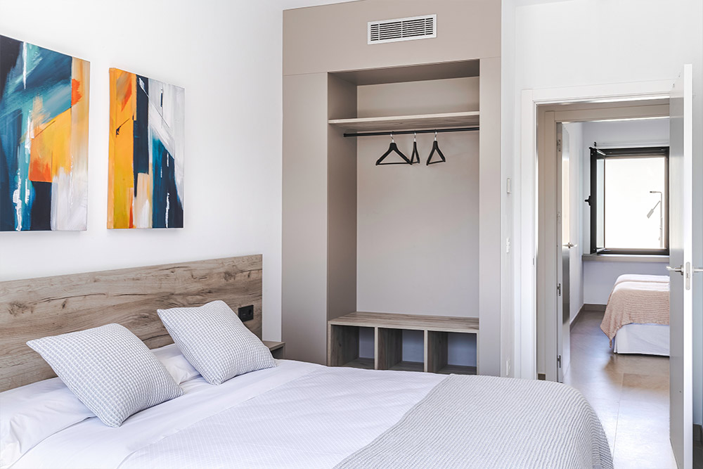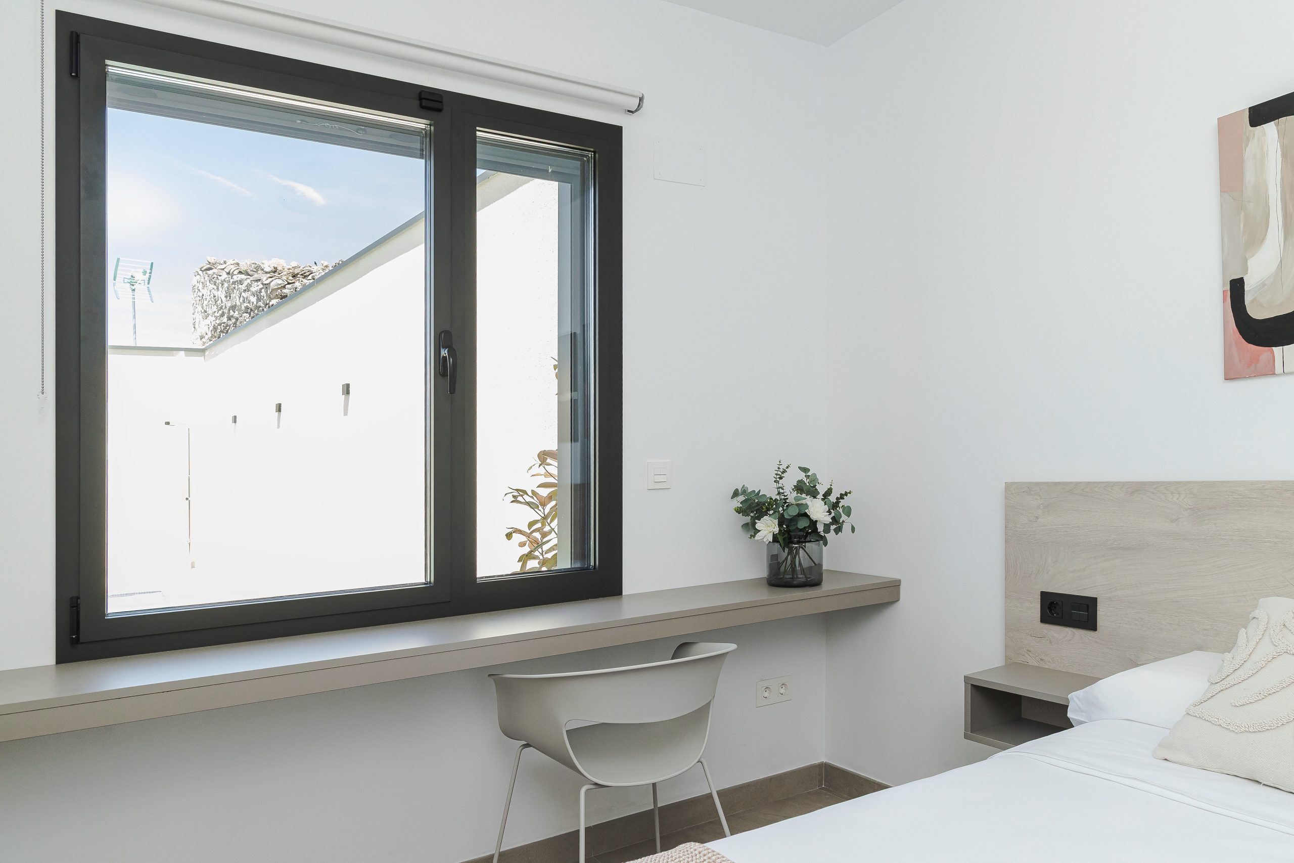 Dormitorio principal con cama de matrimonio y baño privado integrado, equipado con ducha accesible. Un espacio amplio, luminoso y confortable, pensado para ofrecer el máximo descanso, privacidad y bienestar.
