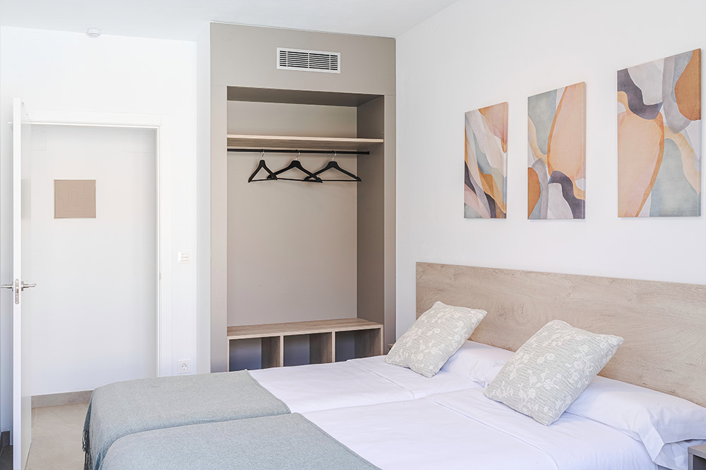 Con dos camas individuales y un ambiente sereno, esta habitación invita al descanso y la desconexión. También dispone de un escritorio funcional, ideal para quienes necesiten un rincón tranquilo de trabajo. Sus vistas a la piscina y al jardín completan una experiencia de tranquilidad y naturaleza.